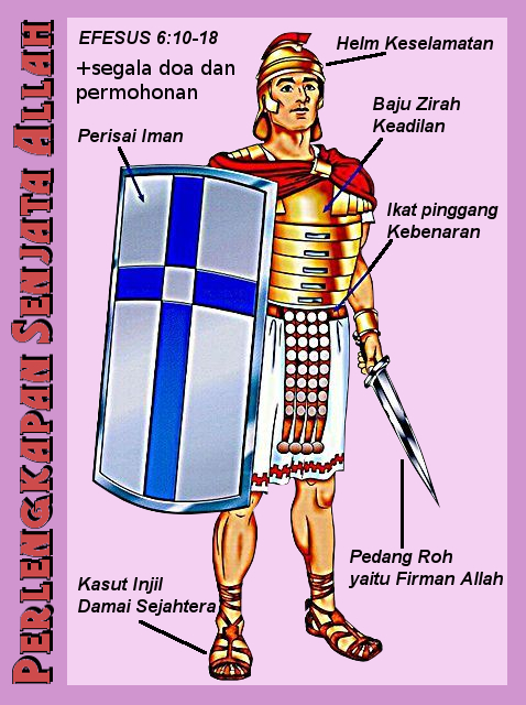 6:10 Akhirnya, hendaklah kamu kuat di dalam Tuhan, di dalam kekuatan kuasa-Nya. 6:11 Kenakanlah seluruh perlengkapan senjata Allah, supaya kamu dapat bertahan melawan tipu muslihat Iblis6:12 karena perjuangan kita bukanlah melawan darah dan daging, tetapi melawan pemerintah-pemerintah, melawan penguasa-penguasa, melawan penghulu-penghulu dunia yang gelap ini, melawan roh-roh jahat di udara. 6:13 Sebab itu ambillah seluruh perlengkapan senjata Allah, supaya kamu dapat mengadakan perlawanan pada hari yang jahat itu dan tetap berdiri, sesudah kamu menyelesaikan segala sesuatu6:14 Jadi berdirilah tegap, berikatpinggangkan kebenaran dan berbajuzirahkan keadilan6:15 kakimu berkasutkan kerelaan untuk memberitakan Injil damai sejahtera; 6:16 dalam segala keadaan pergunakanlah perisai iman, sebab dengan perisai itu kamu akan dapat memadamkan semua panah api dari si jahat, 6:17 dan terimalah ketopong keselamatan dan pedang Roh, yaitu firman Allah, 6:18 dalam segala doa dan permohonan. Berdoalah setiap waktu di dalam Roh dan berjaga-jagalah di dalam doamu itu dengan permohonan yang tak putus-putusnya untuk segala orang Kudus, 6:19 juga untuk aku, supaya kepadaku, jika aku membuka mulutku, dikaruniakan perkataan yang benar, agar dengan keberanian aku memberitakan rahasia Injil, 6:20 yang kulayani sebagai utusan yang dipenjarakan. Berdoalah supaya dengan keberanian aku menyatakannya, sebagaimana seharusnya aku berbicara.