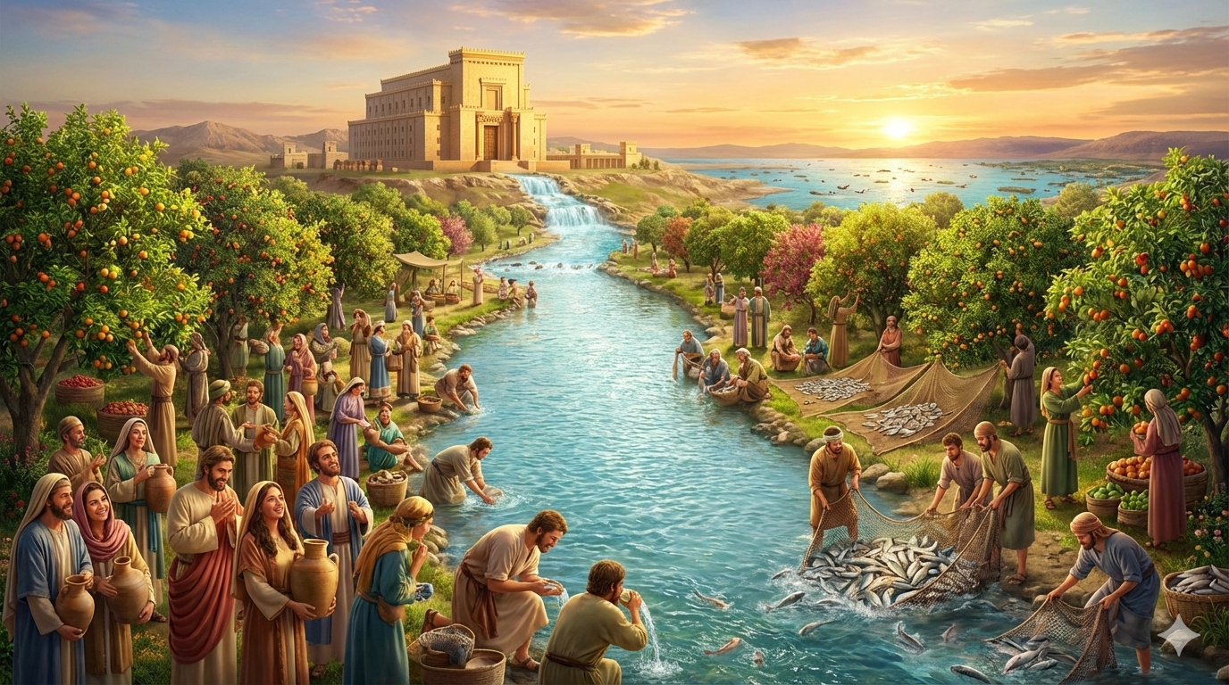 11 Februari 2026 Dibuat dengan Nano Banana Pro dari Google Gemini. Visualisasi orang yang bersukacita di sungai yang membawa kehidupan bagi mereka. Yehezkiel 47 tentang “Sungai air kehidupan” Seri Nabi Besar Shaloom Bapak Ibu Saudara/i yang terkasih dalam Kristus Yesus. Dalam Kesempatan ini kita akan merenungkan bersama mengenai Sungai air kehidupan . Semoga kita semua
